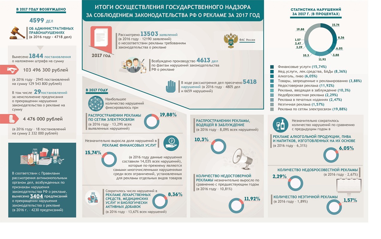 Федеральная антимонопольная служба в 2017 г. рассмотрела 13503 заявления о несоответствии рекламы требованиям закона «О рекламе» и пресекла 5418 нарушений, при этом было возбуждено производство 4613 дел, говорится на сайте ведомства. Также в ФАС сообщают о вынесении 3404 предписаний о прекращении нарушения законодательства о рекламе. В 2016 г. на рассмотрение ведомства поступило 12190 заявлений, при этом было возбуждено 4805 дел и пресечено 6659 нарушений.