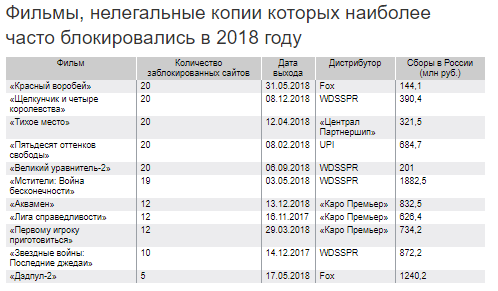 Наиболее активно блокировались пиратские копии боевика «Красный воробей», сказки «Щелкунчик и четыре королевства», хоррора «Тихое место», драмы «Пятьдесят оттенков свободы» и боевика «Великий уравнитель-2». По каждому из фильмов правообладатели добились блокировки 20 ресурсов.
