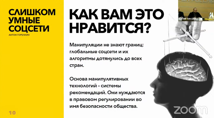 «Глобальные соцсети и их алгоритмы дотянулись до всех стран. Основаманипулятивных технологий — системы рекомендаций. Они нуждаются в правовомрегулировании», — говорилось впрезентациидля участников 14 Форума цифровой безопасности в ОНФ.