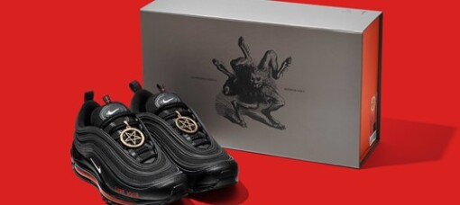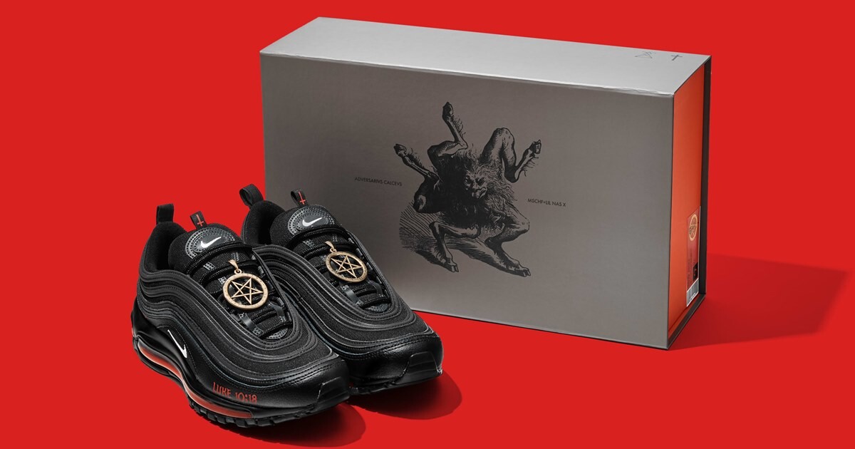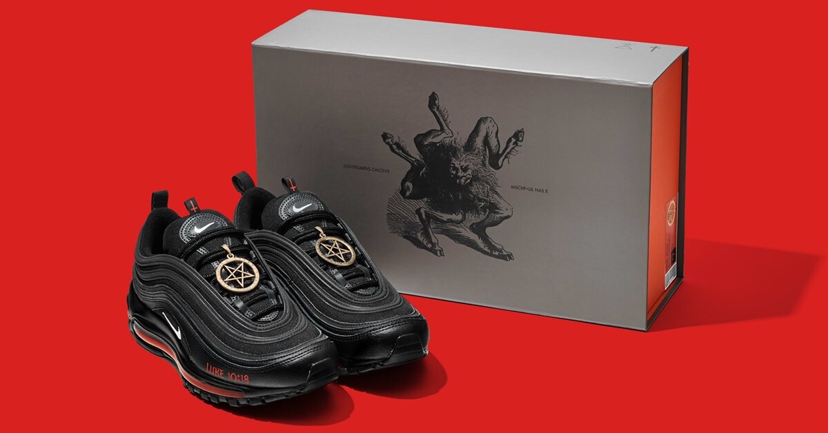 Производитель кроссовокподал всуд на MSCHF после того, как компания выпустила кастомизированные Nike AirMax 97 в партнерстве с рэпером Lil Nas X. На кроссовки нанесена пентаграмма инадпись «Luke 10:18», отсылающая к 18-му стиху десятой главы Евангелия от Лукио низвержении сатаны с небес. В подошве каждой пары — вакуумный пузырь скаплей крови сотрудников MSCHF и чернилами. Компания выпустила 666 кроссовокстоимостью $1018. 665 пар разобрали меньше чем за минуту. Неделю назад Nikeчерез суддобиласьзапрета на их продажу.