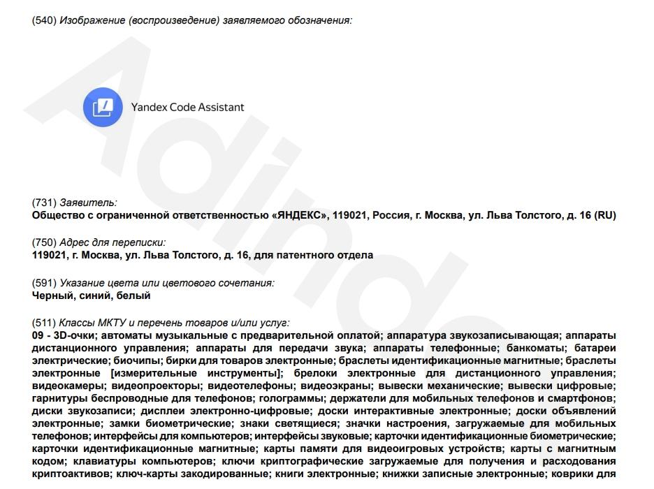 «Яндекс» 9 сентября подал заявку в Роспатент для регистрации товарного знакаYandex Code Assistant. Соответствующий документ обнаружил корреспондентAdIndex.