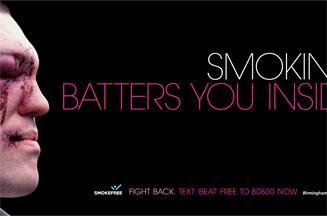 На постерах и листовках изображены трое разных избитых мужчин и слоганы: Cigarettes attack you. But in ways you don't always see / 'Сигареты атакуют вас, хоть это не всегда видно'; Smoking: GBH (Great Bodily Harm) to your insides / 'Курение: тяжкое телесное повреждение изнутри вас'; When you smoke, it's your insides that get beaten up / 'Когда Вы курите, калечатся именно ваши внутренности'.