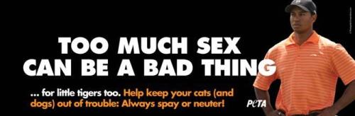 Креатив рекламного сообщения также вряд ли порадует гольфиста: на баннере рядом с фотографией Вудса присутствует надпись ''Too Much Sex Can Be a Bad Thing....For Little Tigers Too. Help Keep Your Cats (and Dogs) Out of Trouble: Always Spay or Neuter!' ('Слишком много секса может навредить и... маленьким тиграм. Избавьте своих кошек (и собак) от проблем: всегда кастрируйте или стерилизуйте их!' Ранее под этим теглайном PETA размещала рекламу с участием прославленных звезд порноиндустрии.