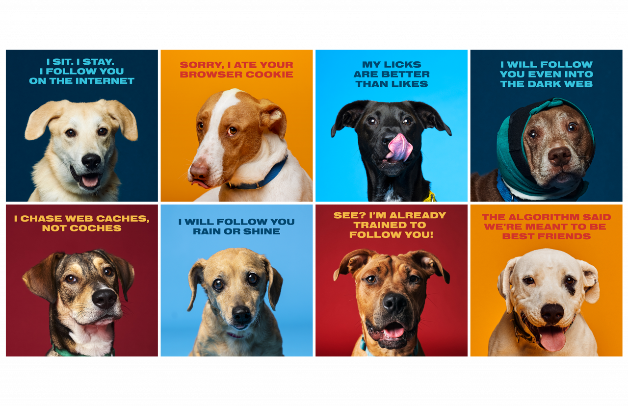 Организация разработала серию баннеров с собаками, которые ищут себе новых хозяев. Они содержат забавные реплики: «Я буду твоим другом даже в даркнете», «Прости, я съел cookie в твоем браузере», «Алгоритм показал, что нам суждено стать лучшими друзьями».