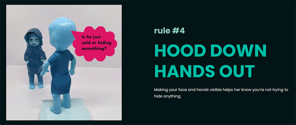 Правила были составлены в партнерстве с организациями Solace Women's Aid(SWA) и Token Man. Мужчинам советуют не ходить за женщинами, снимать капюшон ипо возможности переходить на другую сторону улицы.