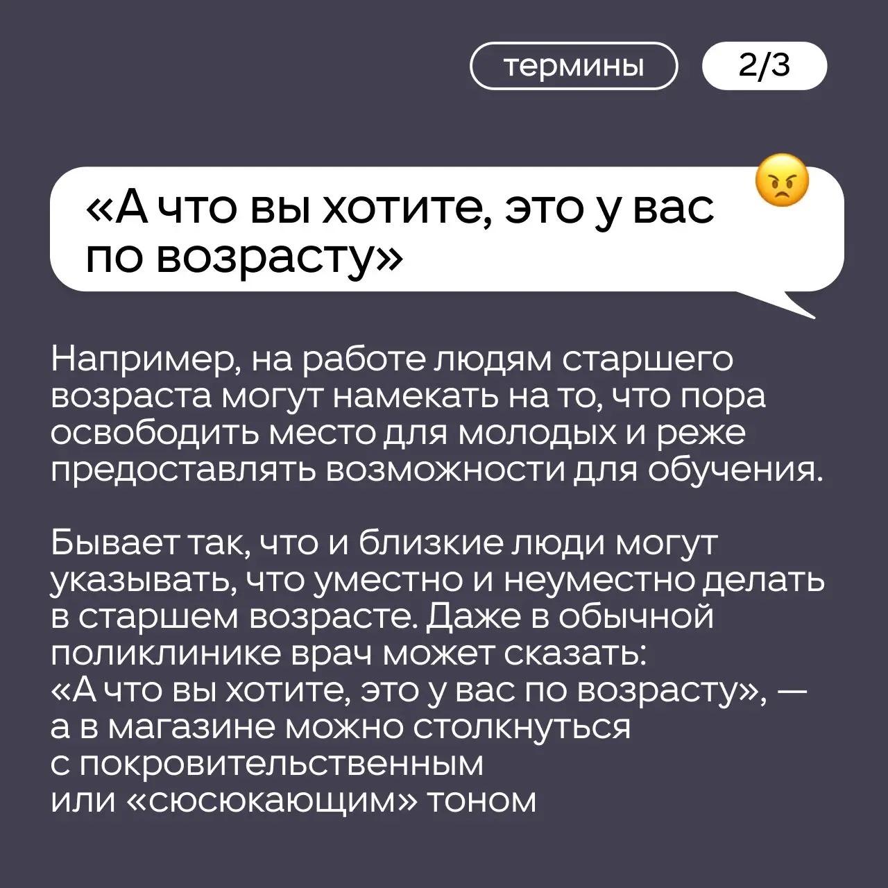 Помимо роликов ОК и Young Old Lab подготовили серию карточек об эйджизме иего проявлениях. Из них пользователи соцсети смогут узнать, чем опаснадискриминация по возрасту и как она проявляется, почему старение часто принятоскрывать и как это можно изменить.