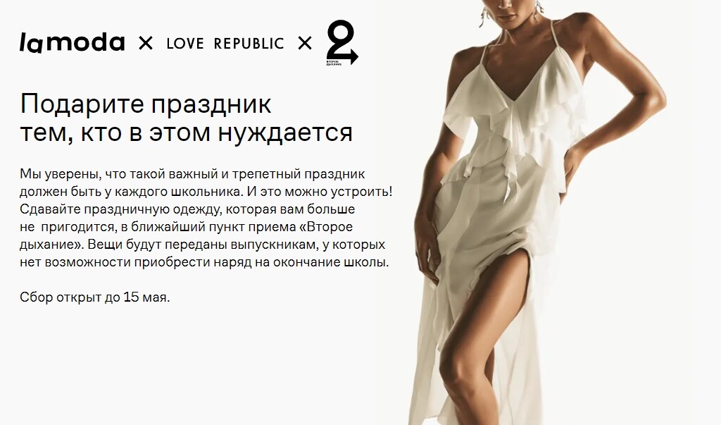 Ретейлеры Lamoda и Love Republic в преддверии сезона выпускных поддержатблаготворительный сбор вечерних образов фонда «Второе дыхание». Бренды помогут1,1 тыс. подростков по всей России, среди которых ребята из малоимущих икризисных семей, дети-сироты, дети с инвалидностью или с особымипотребностями.
