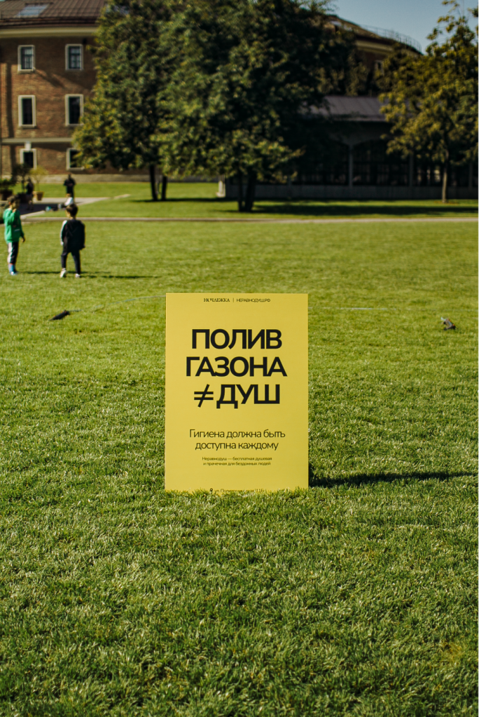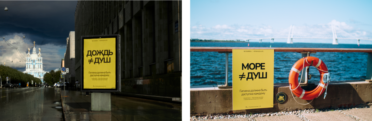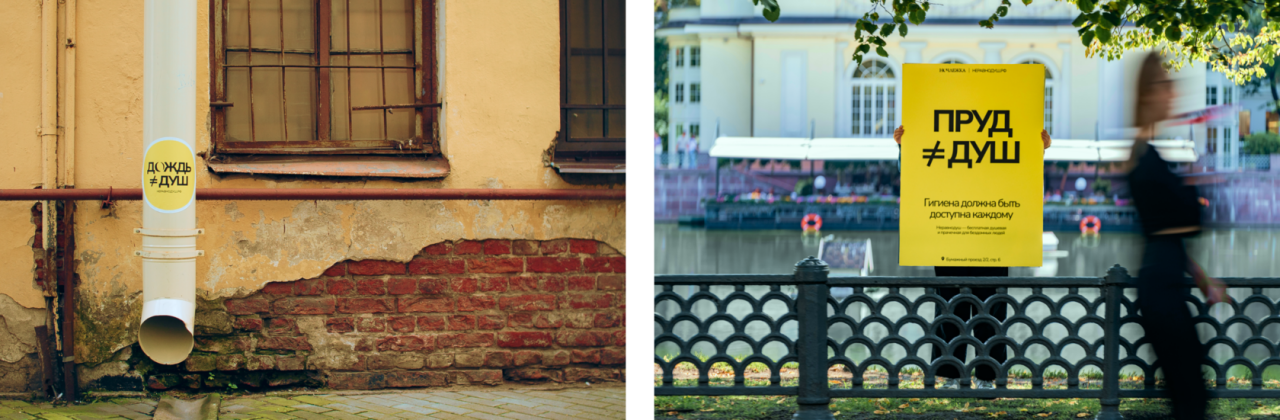 «Ночлежка» решила привлечь внимание к проблеме недоступности гигиены длябездомных. Компания разработала коллекцию табличек с очевидными сообщениями,которые содержат в себе абсурдные противопоставления: «Дождь не равно душ»,«Фонтан не равно душ», «Пруд не равно душ», «Море не равно душ».