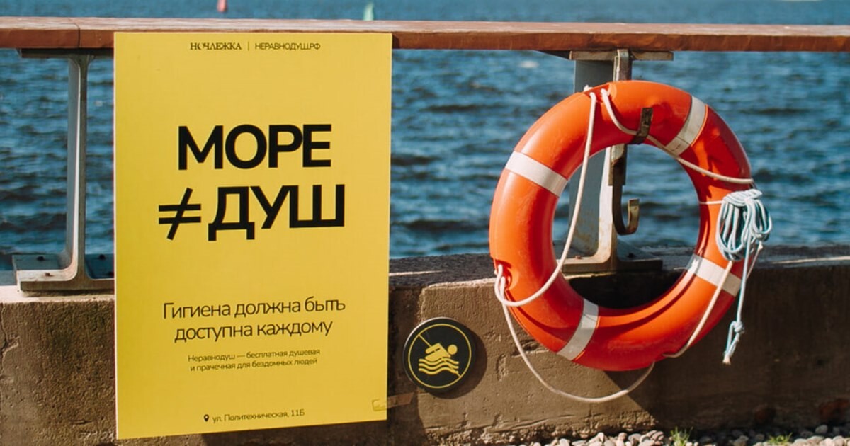 Благотворительная организация «Ночлежка» совместно с агентством Endyразработали креатив для проекта «Неравнодуш». Это душевые пункты и прачечные вСанкт-Петербурге и Москве, где любой желающий может бесплатно помыться ипостирать вещи.