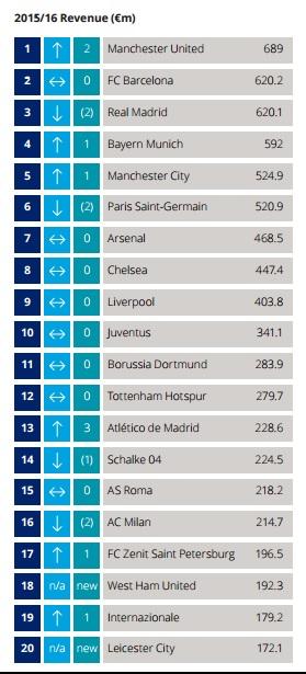 В итоге первое место занял английский «Манчестер Юнайтед», чья выручка составила 689 млн евро. Доходы в дни матчей клуба составила 127,5 млн евро (20% от всей выручки), продажа телеправ принесла 187,7 млн евро (27%), коммерческие поступления – 363,8 млн евро (53%). По сравнению с прошлым годом доходы «МЮ» увеличились на 170 млн.