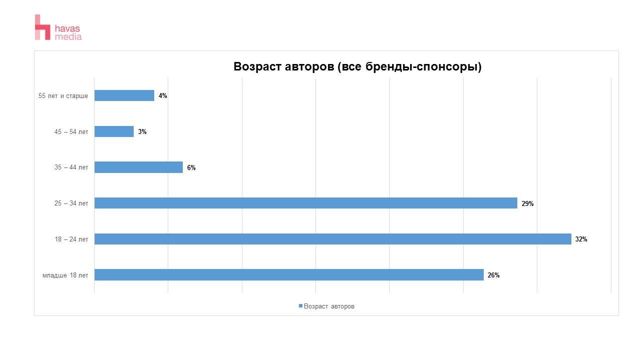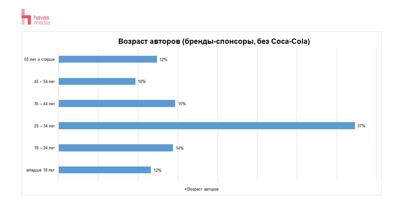 Наиболее активной группой авторов упоминаний брендов в контексте мундиаля стали молодые люди в возрасте 18–24 (по всему списку брендов-спонсоров), чаще мужчины (56%). Высокая доля возрастной группы 18–24 связана с высоким уровнем упоминаемости бренда Coca-Cola относительно других спонсоров чемпионата мира (репосты ссылок на ВК-игру от бренда). Без данной активности возрастной профиль авторов соответствует возрасту наиболее активной интернет аудитории — 25–34 года.
