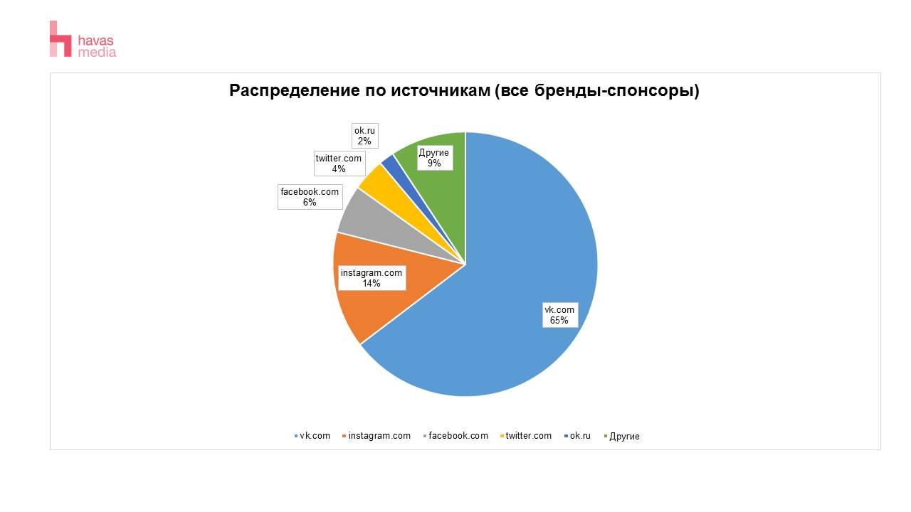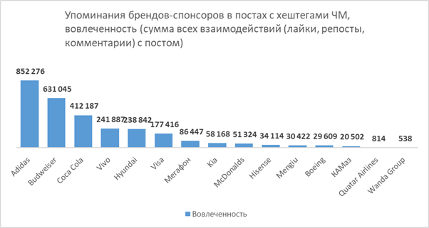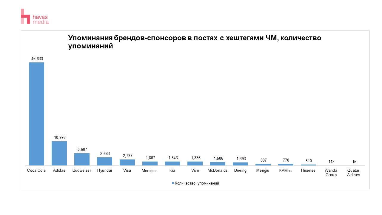 Эксперты Havas Media проанализировали, какие бренды-спонсоры и партнеры чемпионата мира по футболу наиболее активно упоминались пользователями социальных сетей. Были проанализированы упоминания брендов-спонсоров с различными хештегами чемпионата мира по футболу в пределах одного сообщения (посты, репосты, комментарии)