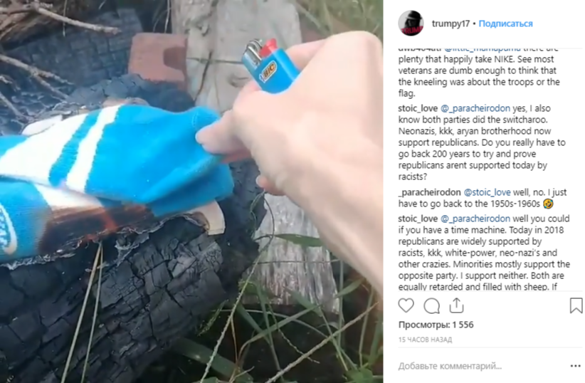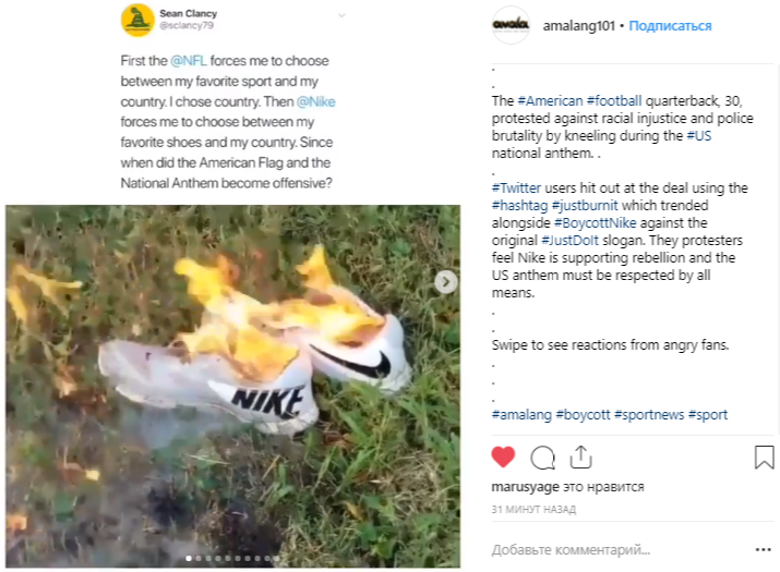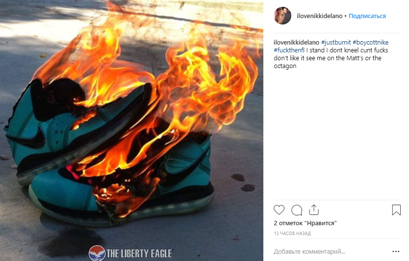 После этого патриотически настроенные американцы начали размещать в сети фото и видео того, как они рвут или сжигают продукцию компании. А в Twitter начали набирать популярность хештеги #BoycottNike и #JustBurnIt.