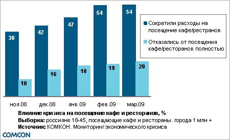 Если в ноябре 2008 г. эту статью расхода в своих семейных бюджетах сократили 38% жителей городов-миллионников, посещающих кафе и рестораны, то в феврале и марте аналогичный показатель вырос до 54%. Доля тех, кто полностью отказался от посещения кафе и ресторанов составляет 20% по состоянию на март 2009. За истекшие пять месяцев с момента получения первых данных Мониторинга это значение увеличилось вдвое.