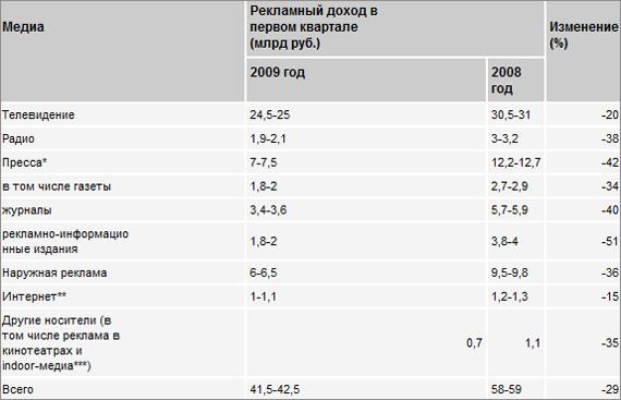 Расходы на рекламу в январе—марте 2009 года снизились на 29%, до 41,5-42,5 млрд руб., объявила вчера Ассоциация коммуникационных агентств России (АКАР).
