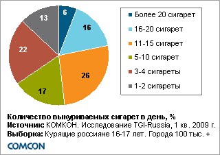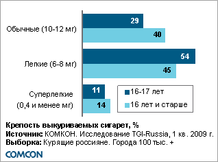 Подавляющее большинство курящей возрастной группы 16-17 лет составляют мужчины (68% по данным 1 квартала 2009 г.). Доля курящих девушек составляет почти треть опрошенных лет (32% по данным 1 квартала 2009 г.). На протяжении последних нескольких лет такое соотношение курящих мужчин и женщин 16-17 лет остается достаточно стабильным.26% опрошенных выкуривают 11-15 сигарет в день. Доля подростков, выкуривающих не более 1-2 сигарет в день – составляет 13%. Самые активные курильщики, потребляющие более одной пачки в день, составляют меньшинство – 6% респондентов.Большинство курящих подростков (54% опрошенных) отдает предпочтение легким сигаретам. В этой возрастной группе доля предпочитающих этот вид сигарет существенно выше, чем среди всех курящих в возрасте 16+ (45% респондентов). Можно предположить, что это является прямым следствием рекламы, представляющей легкие сигареты как модный и одновременно менее вредный для здоровья товар по сравнению с обычными сигаретами, потребление которых в рассматриваемой группе составляет 29% (данные TGI-Russia 1 квартал 2009 г.).
