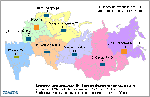 Анализ географической специфики показывает, что регионами с самыми высокими долями курящих подростков 16-17 лет являются Москва (выделяется в отдельную территориальную единицу в исследовании TGI-Russia) и Дальневосточный федеральный округ. Минимальная доля курящей молодежи приходится на Южный федеральный округ (6% респондентов).
