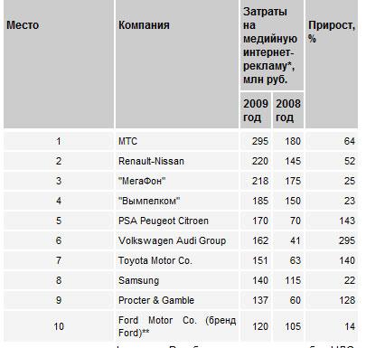 Десять крупнейших рекламодателей рунета в 2009 году потратили 1,8 млрд руб., или на 24,1% больше, чем годом ранее. Особенно не скупились автопроизводители (бюджеты тех, кто попал в топ-10, выросли на 14-295%) и сотовые компании (на 23-64%). Во всех других сегментах — в наружной рекламе, прессе, на радио и телевидении — затраты только сокращались.