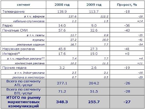 Объем рынок контекстной рекламы по итогам года составил 11,3 млрд руб. (рост на 11%), а на медийную рекламу пришлось 7,7 млрд руб. (рост 4%). Для сравнения: на телевизионную рекламу было потрачено 112,2 млрд руб., что на 18% ниже показателя 2008 года. Хуже всего дело обстоит с печатными СМИ и наружной рекламой — рынок сократился на 43% и 41% соответственно.