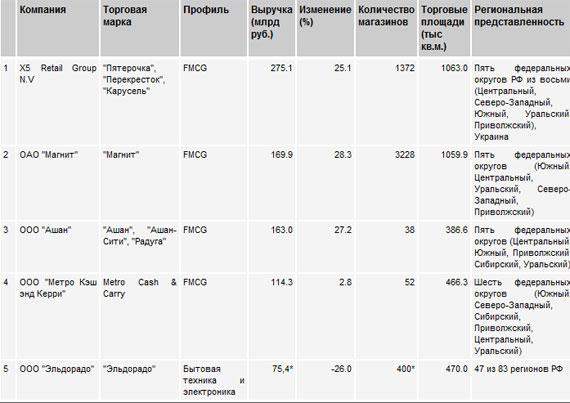 50 крупнейших ритейлеров в России в 2009 году контролировали 12,8% всего розничного рынка, подсчитал журнал Retailer Magazine. Их совокупная выручка увеличилась на 8%, быстрее росли продуктовые и парфюмерно-косметические сети, а вот продавцы бытовой техники, электроники и мобильных телефонов в среднем вообще сократили продажи