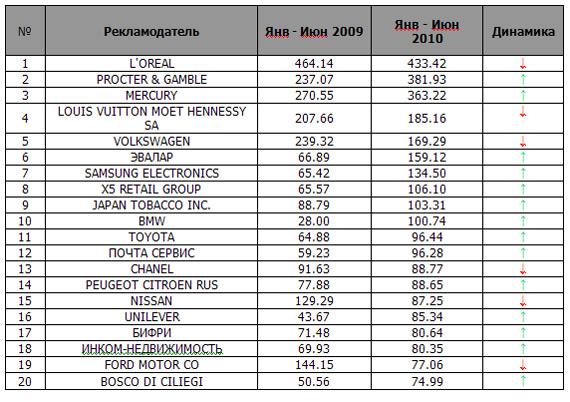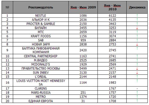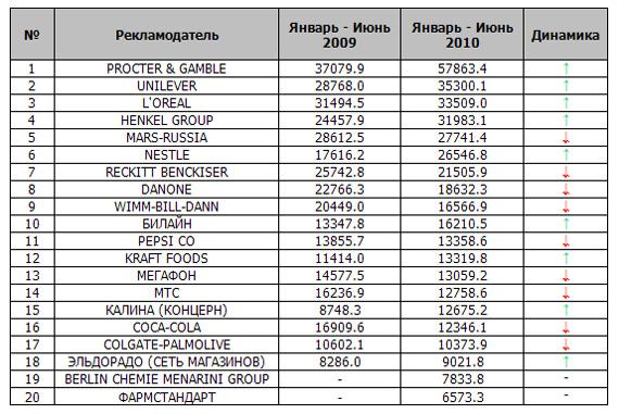 Так, согласно результатам исследований компании TNS Media Intelligence на ТВ в первом полугодии 2010 года, как и в первые 6 месяцев 2009 года, тройка лидеров сохраняется. По сравнению с аналогичным периодом прошлого года, лидер топ-3 компания PROCTER&GAMBLE увеличила объемы размещаемой рекламы примерно на 36% (с 37079,9 до 57863,4 GRP 30'). На одну позицию вверх поднялась компания UNILEVER, объемы рекламы которой, по сравнению с 2009 годом, тоже значительно возросли. Тройку лидеров замыкает L'OREAL.