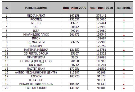 В свою очередь, на радио по итогам первых шести месяцев 2010 года наблюдаются изменение в топ-3. По сравнению с прошлым годом набирает обороты компания MEDIA MARKT и занимает уверенную лидерскую позицию. Объемы рекламы на радио MEDIA MARKT возросли более чем в два раза (3740142 сек.).
