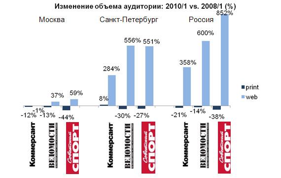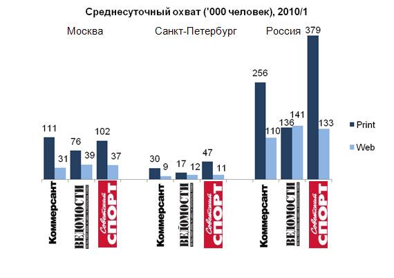 Объем аудитории ежедневных изданий, таких как «Коммерсантъ», «Ведомости» и «Советский спорт», в 2-3 раза превышает их web-версии: