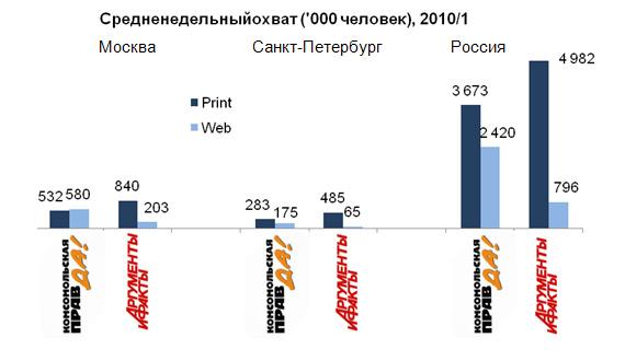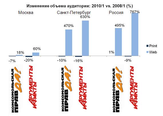 У еженедельных Комсомольская правда и АиФ объем аудитории веб-версий также приближается к объему аудитории печатных версий, а в Москве читатели сайта kp.ru уже превысили бумажную 'Комсомолку' по размеру аудитории: