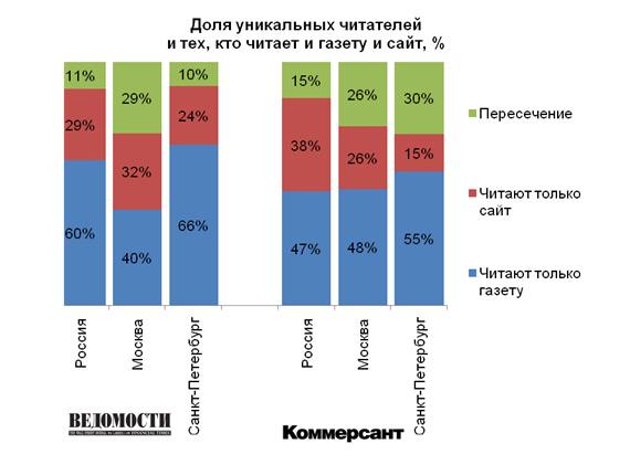 Так, например, среди аудитории «Ведомостей» в Москве, почти каждый третий читает и газету, и сайт, тогда как в Петербурге таких всего 10%. При этом петербуржцы больше отдают предпочтение печатным «Ведомостям». В целом по России ситуация схожа с питерской.