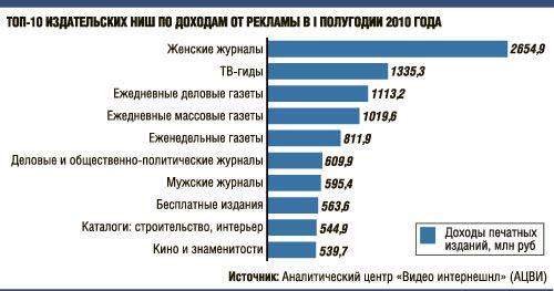 Лучше всего после прохождения пика кризиса чувствуют себя издания по трудоустройству и телегиды. По данным исследования рекламных доходов в прессе за первое полугодие 2010 года, проведенного аналитическим центром «Видео интернешнл» (АЦВИ), у этих изданий наблюдается наибольший прирост рекламных доходов по сравнению со среднерыночными показателями. По оценке АЦВИ, с 2008 года состав лидирующих ниш по доходам от рекламы значительно изменился. Из топ-списка 2008 года исчезли автомобильные журналы и рекламные каталоги автомобильной тематики, а также газеты по трудоустройству. Вместо них в группе лидеров появились журналы о кино и знаменитостях, бесплатные издания и еженедельные газеты. «Автомобильные издания сильно потеряли в доходах, так как кризис в мировом автопроме был особенно глубоким»,- Прокомментировала ситуацию руководитель отдела исследования прессы АЦВИ Екатерина Ерошкина. По темпам прироста доходов от рекламы (по сравнению со среднерыночными) в первом полугодии 2008 года лидировали следующие издательские ниши: «Кино и знаменитости» (+50,9%), «Еженедельные газеты» (+42,1%), «Мужские журналы» (+33,5%).