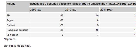 Свой прогноз по медиаинфляции на 2011 год входящее в коммуникационную группу Twiga агентство Media First назвало в адресованном клиентам и партнерам аналитическом отчете за сентябрь. Заявленные цифры основаны на предварительных переговорах с медиаплощадками, уточнил 'Ъ' гендиректор Media First Юрий Малинин. Рост цен возобновился уже в этом году, следует из данных агентства. Так, если в 2009 году размещение на ТВ в среднем подешевело на 15%, то в этом уже подорожает на 10%. А например, расценки в наружной рекламе после 35-процентного спада в 2009-м по итогам этого года вырастут на 10%. По оценке Ассоциации коммуникационных агентств России, в январе-июне общие затраты на телерекламу выросли на 7%, до 55,9-56,4 млрд руб., на 'наружку' — на 13%, до 15-15,2 млрд руб. Но эти показатели учитывают как изменение цен, так и увеличение числа рекламодателей и их бюджетов.