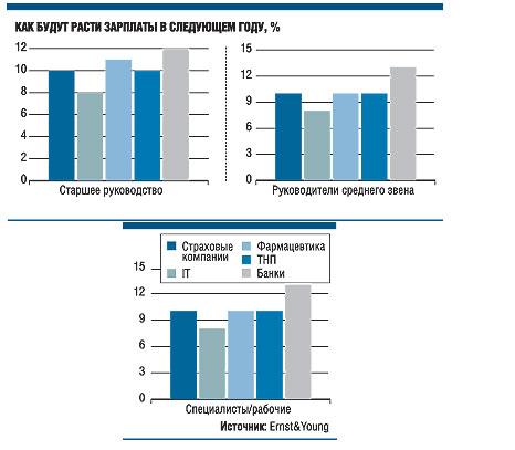 Около 80% компаний, принявших участие в опросе Ernst & Young, заявили о своей готовности повысить жалованье сотрудникам в 2011 году в среднем на 10%. Оптимистичные ожидания работодателей заметны уже сейчас: средний рост зарплат в этом году на 3,9% превосходит уровень инфляции. К тому же компании намерены увеличить численность сотрудников на 13%.Рынок труда в России восстанавливается. Около 80% компаний запланировали повышение зарплаты на 2011 год в среднем на 10% (в опросе приняли участие 182 международные и российские компании). Почти половина работодателей намерена расширить персонал в среднем на 13%, и лишь 10% нанимателей собираются сократить работников на 10%. Большинство компаний планируют возобновить рост инвестиций в персонал, сокращенный в период кризиса.