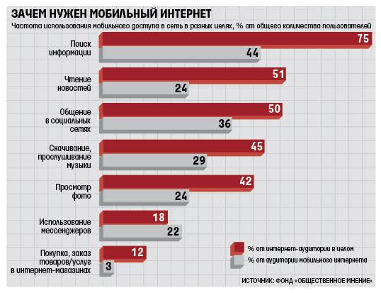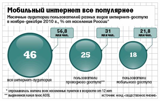 Ведомости ознакомились с результатами исследования «Мобильный интернет в России», проведенного фондом «Общественное мнение» (ФОМ) в ноябре — декабре 2010 г. Фонд провел репрезентативный опрос населения России в возрасте от 12 лет и старше — 6474 человек в 64 субъектах Федерации, от сел до городов-миллионников. В итоге ФОМ оценил ежемесячную аудиторию мобильного интернет-доступа в 21,8 млн человек — примерно 18% населения (за месяц, предшествующий опросу, они хотя бы раз воспользовались интернетом с мобильного устройства). Общая месячная аудитория интернета составляла 56,8 млн человек (46% населения). А проводным широкополосным интернет-доступом (по выделенной или ADSL-линии) пользовалось 25% россиян. Таким образом, разрыв между пользователями фиксированного домашнего и мобильного доступа составляет, по оценке ФОМ, всего около 7 п. п.