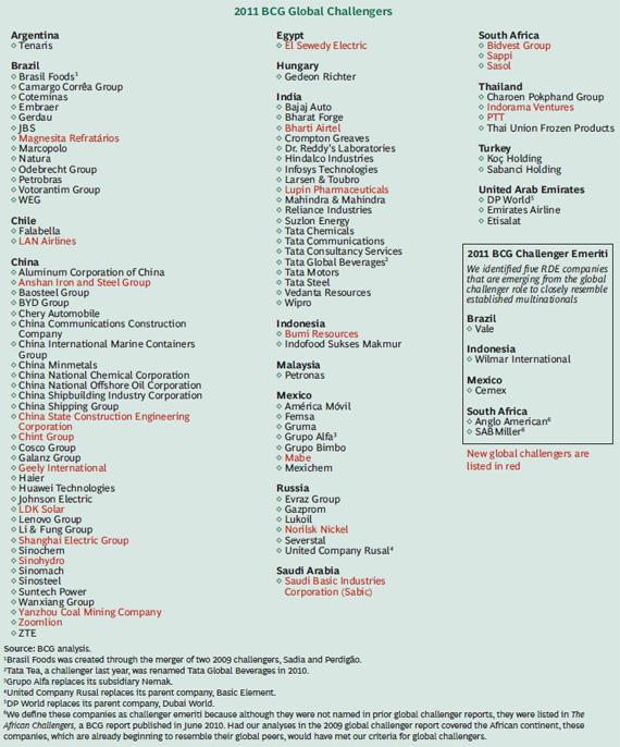 На международной арене появляются новые претенденты на мировое господство – новое поколение компаний-владельцев брендов из развивающихся стран. Boston Consulting Group составила список 100 компаний из развивающихся стран, способных изменить расстановку сил на мировом рынке «Global Challengers» («Мировые конкуренты»).