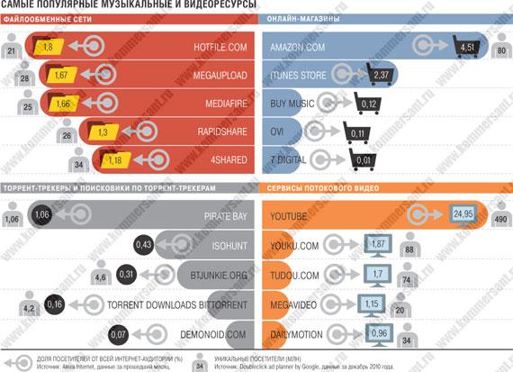 Наряду с общим числом посетителей пиратских сайтов MarkMonitor определил три самых популярных домена, на которых можно встретить ссылки на файлы с нелегальным контентом,— Rapidshare.com, Megavideo.com и Megaupload.com. Общее число интернет-пользователей, обращающихся к этим сайтам, составляет 21 млрд человек в год.