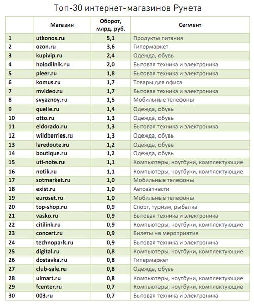 Торгующий продуктами питания лидер получил в 2010 г. 5,1 млрд руб., занимающий второе место ozon.ru - 3,6 млрд руб. Показатели остальных участников можно увидеть в таблице ниже. Интересно, что сайты таких грандов торговли вычислительной и бытовой техникой, как “М-Видео”, “Эльдорадо”, “Белый ветер - цифровой” заняли всего 7, 11 и 25 места с выручкой 1,7 млрд руб., 1,3 млрд руб. и 800 млн руб. соответственно.