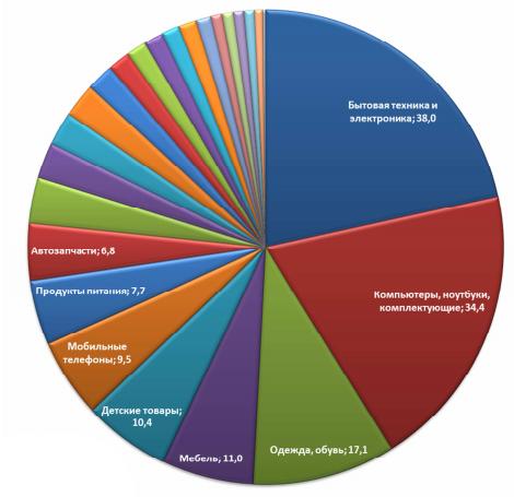 Insales призывают не сравнивать результаты с прошлогодним исследованием - данными по продажам в 2009 г., т.к. количество проанализированных магазинов с тех пор выросло с 1500 до 4500 и изменился классификатор. Но все же упомянем, что в аналогичном отчете годом ранее аналитики говорили об общем объеме рынка 101 млрд руб. Первая тройка на нем осталась неизменной (техника, компьютеры, одежда), правда, доля одежды заметно сократилась.