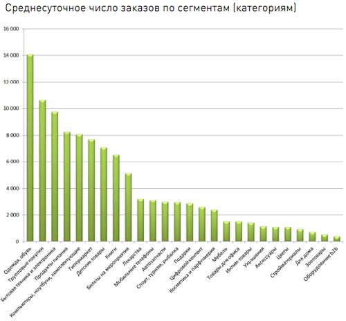 Интересный показатель - количество получаемых за сутки заказов в разных сегментах. Магазины одежды за день обрабатывают около 14 тыс. обращений. На втором месте групповые покупки с количеством заказов более 10 тыс., но в общем обороте рынка их доля остается незначительной. Для сравнения разная техника и продукты питания, на суммарную долю которых приходится половина продаж - это от 8 до 10 тыс. заказов ежемесячно в каждой из этих сфер.