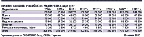 Через пять лет российский рекламный рынок вырастет более чем в два раза, до 482 млрд руб., следует из прогноза развития рынка до 2015 года, подготовленного группой OMD MD/PHD Group (входит в BBDO Russia). По итогам 2011 года кризис на телевидении будет полностью преодолен. Рост бюджетов будет происходить по всем медиаканалам, однако их востребованность среди рекламодателей значительно изменится.
