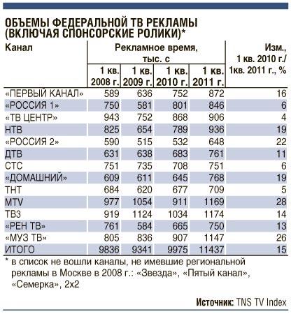 Генеральный директор ООО «Газпром-медиа» Сергей Пискарев подтвердил, что объемы федеральной рекламы в секундах на каналах НТВ и ТНТ в первом квартале увеличились, «так как в этом году спрос на федеральное размещение выше, чем в прошлом». «Колебания объемов размещения на НТВ в секундах в пределах нормы, — прокомментировал генеральный директор «Алькасара» Петр Рыбак. — Существующая система управления инвентарем канала допускает возникновение таких колебаний. Рост по ТНТ объясняется тем, что начали восстанавливаться продажи ночного эфира — с 2.00 до 9.00, который в кризис не пользовался спросом у рекламодателей». По прогнозам группы, в 2011 году произойдет сокращение доли региональной рекламы в общем объеме телерекламного рынка, но в денежном выражении рынок существенно вырастет. При этом цены на оставшийся региональный инвентарь будут значительно выше.