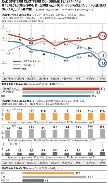 *Показатели 'Первого канала', 'России 1' и НТВ приводятся в аудитории 'все россияне старше 18 лет' (целевая для этих каналов). **Показатели СТС приводятся в аудитории 'все россияне от 14 до 44 лет' (целевая для СТС). ТНТ — 'все россияне от 18 до 30 лет' (целевая для ТНТ), РЕН ТВ — 'все россияне от 25 до 54 лет' (целевая для РЕН ТВ). Данные представлены TNS Russia специально для 'Ъ'.
