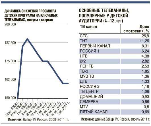 За последние четыре года доля детских программ и анимации сократилась почти в два раза. Это привело к 40-процентному сокращению объемов рекламы в этих передачах, рассчитанному в терминах GRP (выставленные на продажу пункты рейтинга — условная единица, по которой продается телереклама. — РБК daily) на аудиторию зрителей от 4 до 12 лет. Эту тенденцию не смогло компенсировать даже появление в национальном телевизионном эфире телеканала «2х2», программная сетка которого практически полностью состоит из мультфильмов, говорится в исследовании OMD MD|PHD Group.