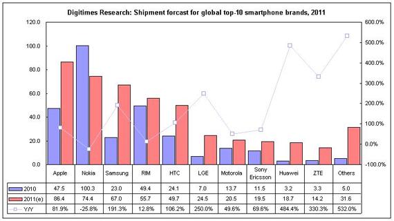 Аналитики Digitimes Research подсчитали, что по итогам 2011 года Apple с большой вероятностью станет ведущим поставщиком смартфонов в мире по числу проданных устройств, сместив Nokia
