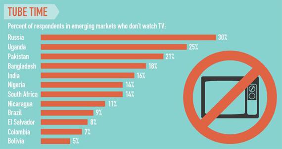 Согласно исследованию, проведенному Jana.com, такое запросто можно услышать и в России. Почти треть россиян (30%) не смотрит телевизор вообще или смотрит очень мало - несмотря на то, что телевизоры есть едва ли не в каждой российской квартире. За Россией идет Уганда. Там телевизором не интересуются 25% населения. На третьем месте Пакистан (21%).
