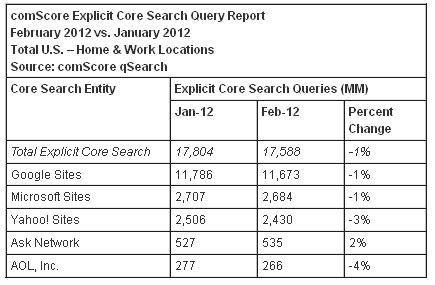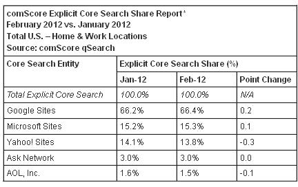 Компания comScore опубликовала ежемесячный отчет об изменении популярности поисковых систем в США за январь-февраль 2012 г. Согласно отчетам, лидирующее место по-прежнему занимает Google. В феврале его доля на поисковом рынке увеличилась с 66,2% до 66,4%. Положительную динамику демонстрирует и Bing от Microsoft (15,3% в феврале)