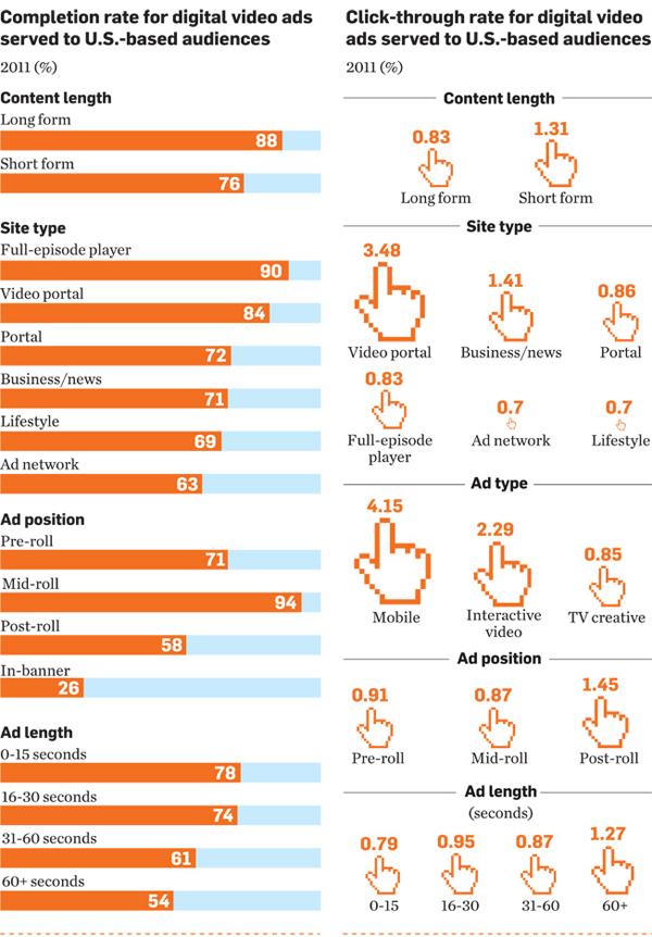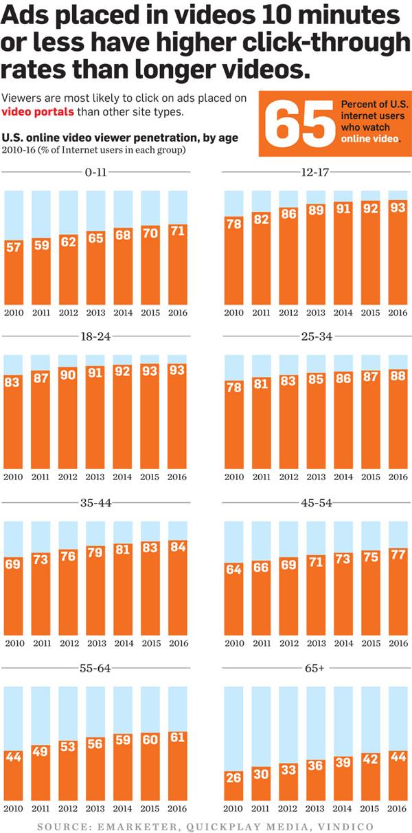 Почти половина населения США и 65% интернет-пользователей смотрели онлайн-видео в 2010 году. Онлайн-видео также стало четвертой по популярности категорией в работе с интернет-рекламой, принесшей доходы в размере $3 миллиардов. И ожидается, что эта популярность к 2014 году только увеличится. Одна из причин того, почему маркетологи так любят онлайн-видео - потребители, кажется, и в самом деле смотрят эти ролики. В 2011 году были просмотрены до конца 88% полнометражных (от 10 минут и больше) рекламных роликов и 76% короткометражных.