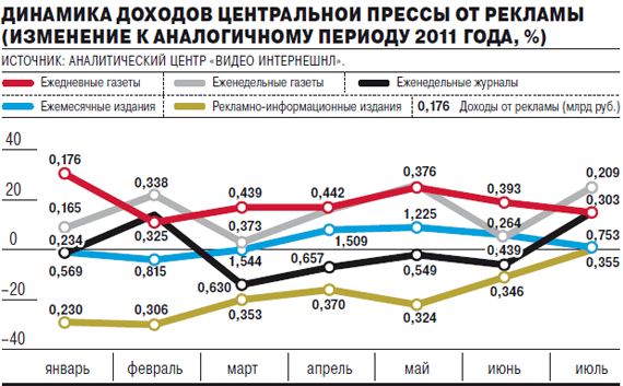 Рекламные доходы центральной прессы, еще в начале года демонстрировавшие отрицательную динамику, восстанавливаются, констатирует аналитический центр Видео Интернешнл (АЦВИ). Минувший июль стал первым месяцем, когда рекламная выручка выросла и у газет, и у журналов. Даже рекламно-информационным изданиям удалось остановить продолжающееся уже не первый год падение