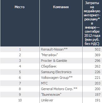 Крупнейшим рекламодателем рунета, по версии Vizeum Digital, является альянс Renault-Nissan, потративший в январе—сентябре этого года 502 млн руб. без НДС. Всего в первой десятке представлены три автопроизводителя, три оператора связи, два производителя товаров повседневного спроса, один — бытовой техники и одна кредитная организация. Поскольку Vizeum Digital составляет свой рейтинг впервые, динамика бюджетов не приводится. Приведенная по 'Вымпелкому' оценка (197 млн руб.; девятое место) близка к истине, прокомментировал расчеты агентства представитель оператора.