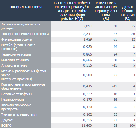 В целом за девять месяцев расходы на медийную интернет-рекламу выросли, по оценке Ассоциации коммуникационных агентств России (АКАР), на 25%, до 11,6 млрд руб. Основные для интернета категории рекламодателей продемонстрировали лучшую, чем рынок в целом, динамику, следует из подсчетов Vizeum Digital. Совокупный бюджет производителей товаров повседневного спроса увеличился на 27%, до 2,3 млрд руб., автопроизводителей и их дилеров — на 30%, до 2,9 млрд руб., ритейлеров — на 44%, до 930 млн руб., банков и страховщиков — и вовсе на 65%, до 1,4 млрд руб.