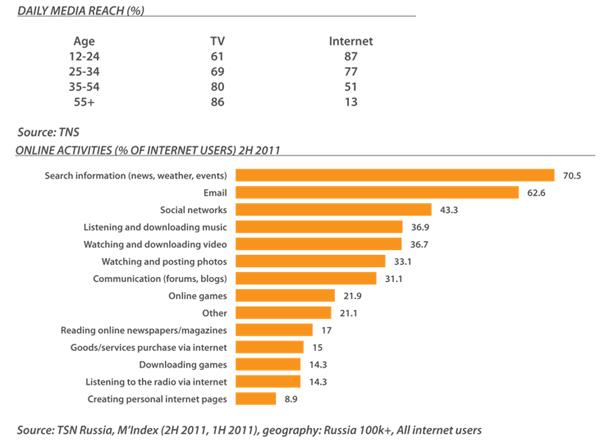 Телевидение продолжает оставаться самым популярным медиа среди россиян. По данным TNS взрослые в среднем проводят около 233 минут ежедневно у экрана телевизора, а в интернете лишь 44 минуты. Тем не менее, за последние три года время пребывания в интернете увеличилось в 2,5 раза и продолжает расти.